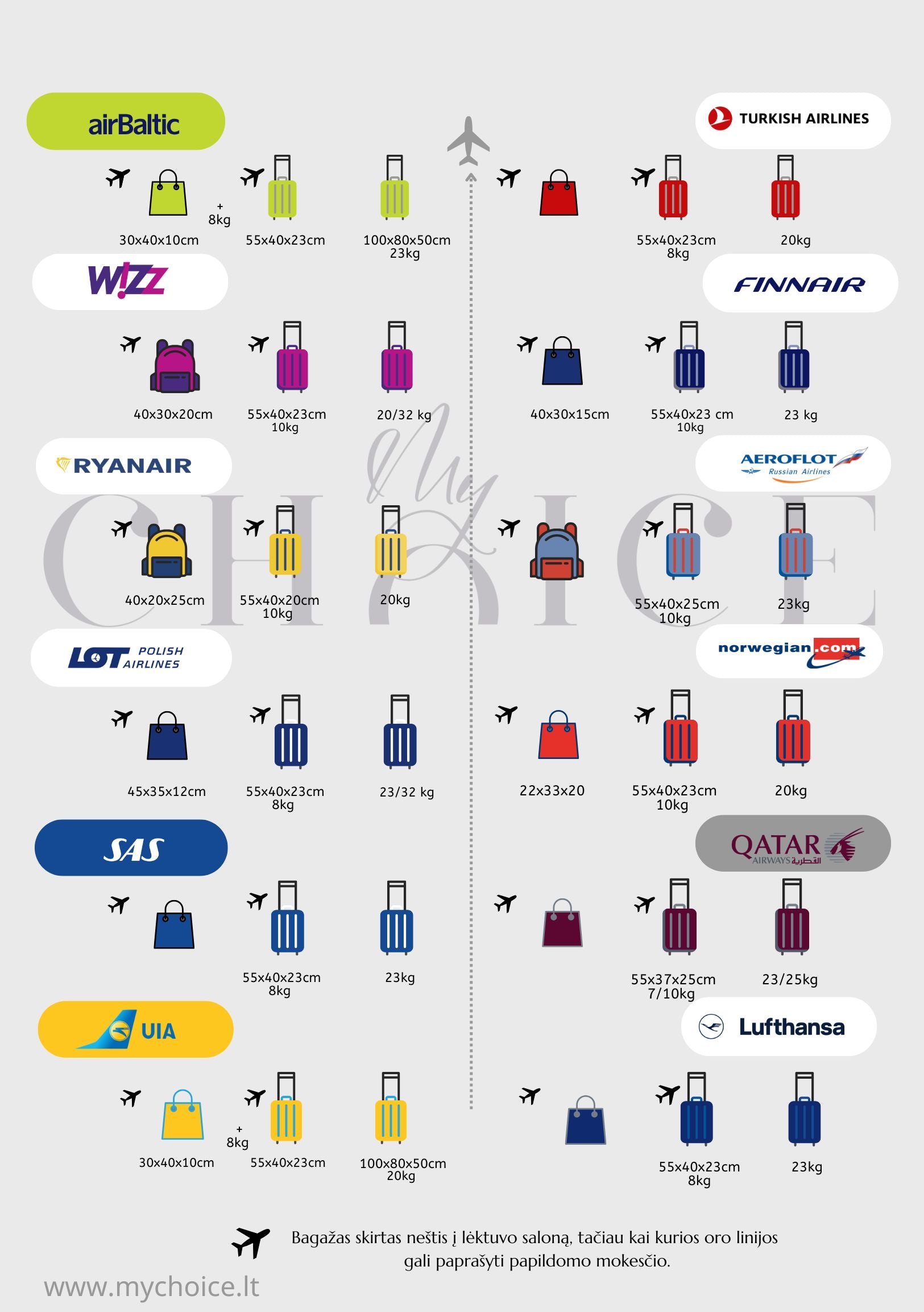 Aviakompanijų lagaminų dydžio taisyklės gali šiek tiek skirtis, todėl svarbu pasitikrinti kiekvienos konkrečios aviakompanijos reikalavimus prieš kelionę. Čia pateikiama bendra apžvalga, bet visada rekomenduojama pasitikrinti konkrečios aviakompanijos svetainėje.